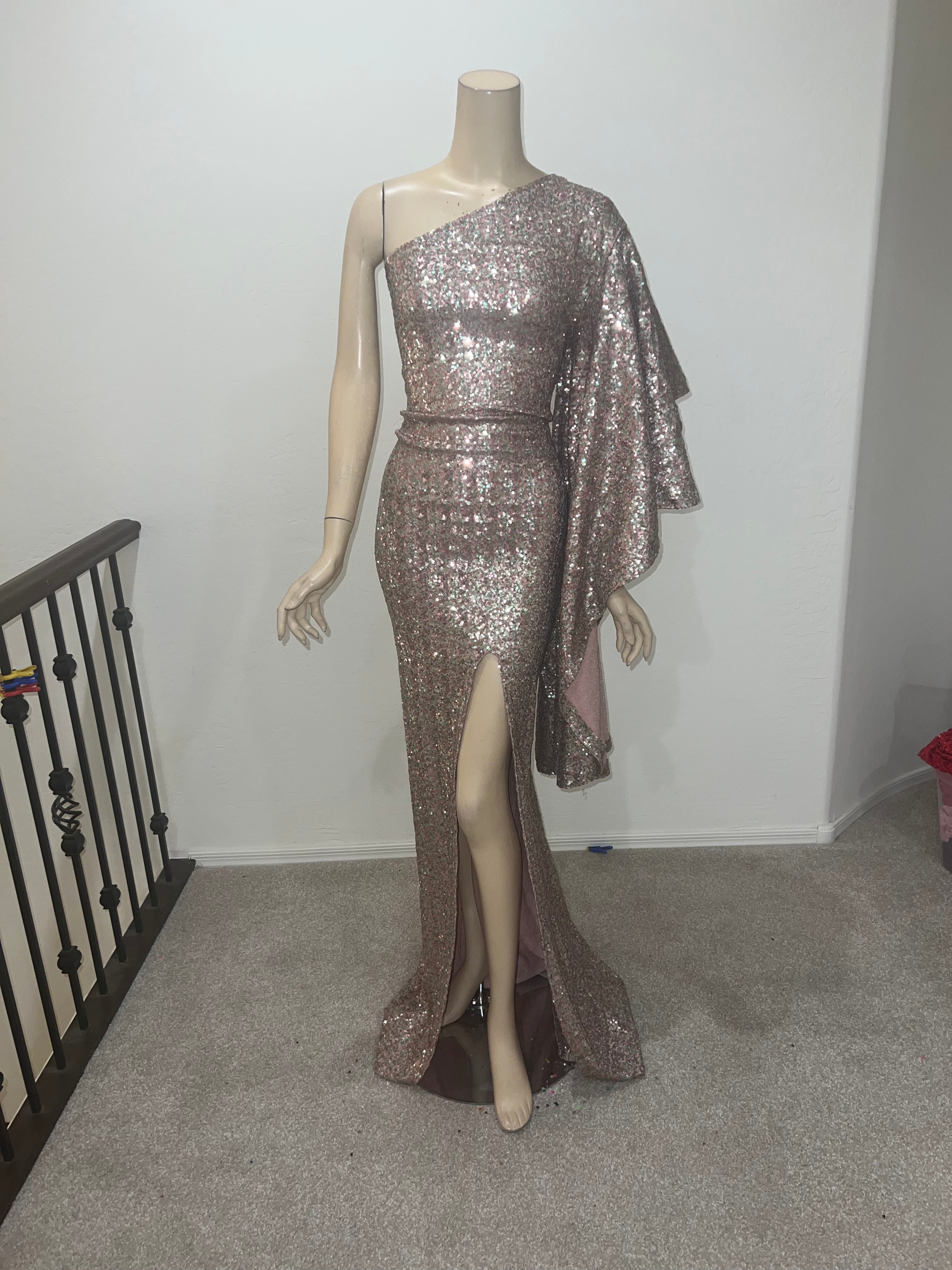 Full length gown with a 1 shoulder drama  sleeve, and a slit on the leg .   Made from a gorgeous champagne sequin with hints of aqua sequin throughout.
