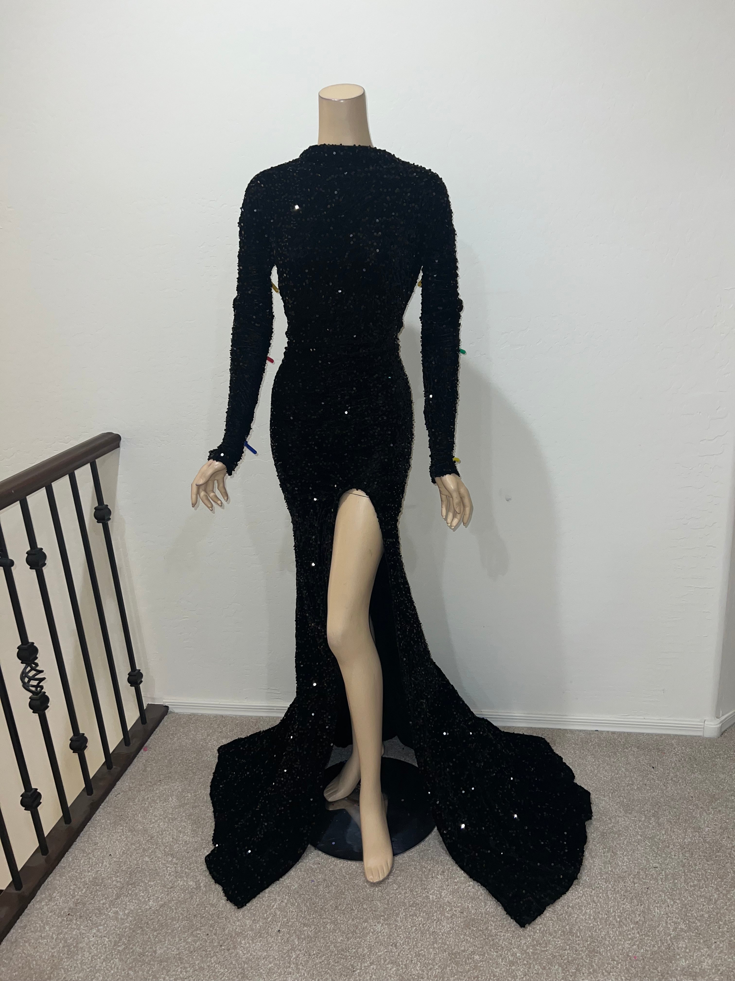 Full length gown with a high neckline, fitted sleeves with a slit on the leg and a train in back. Long zipper in back for easy changes. Made from a gorgeous high quality stretch velvet fabric covered in sparkling Black sequin.