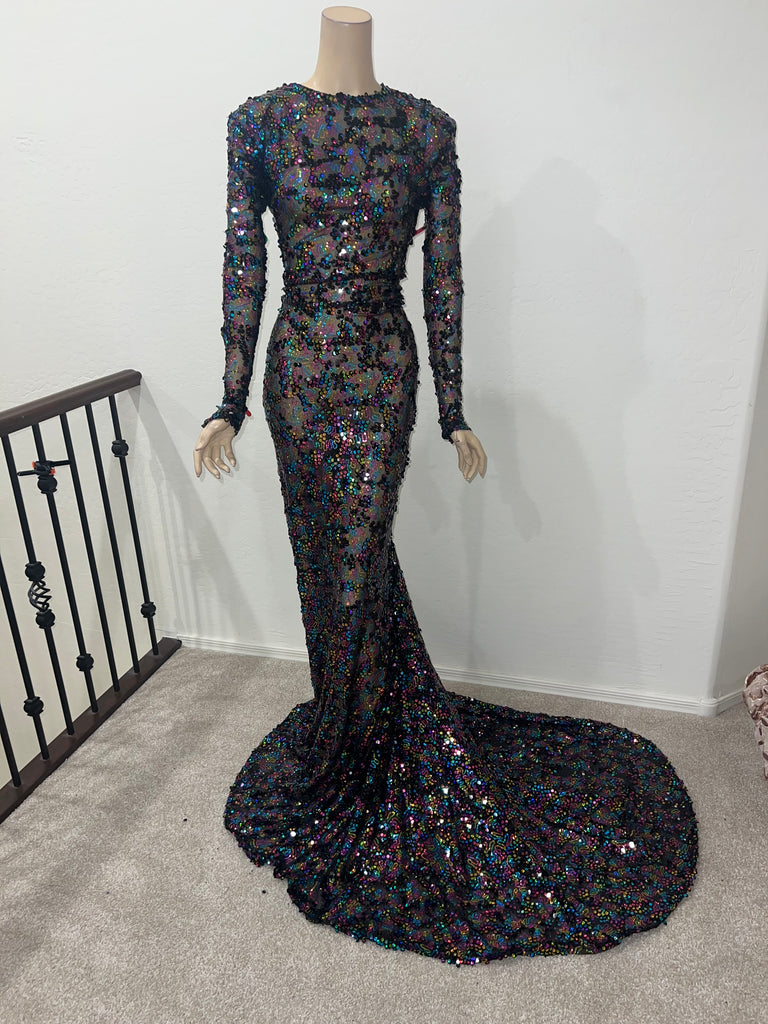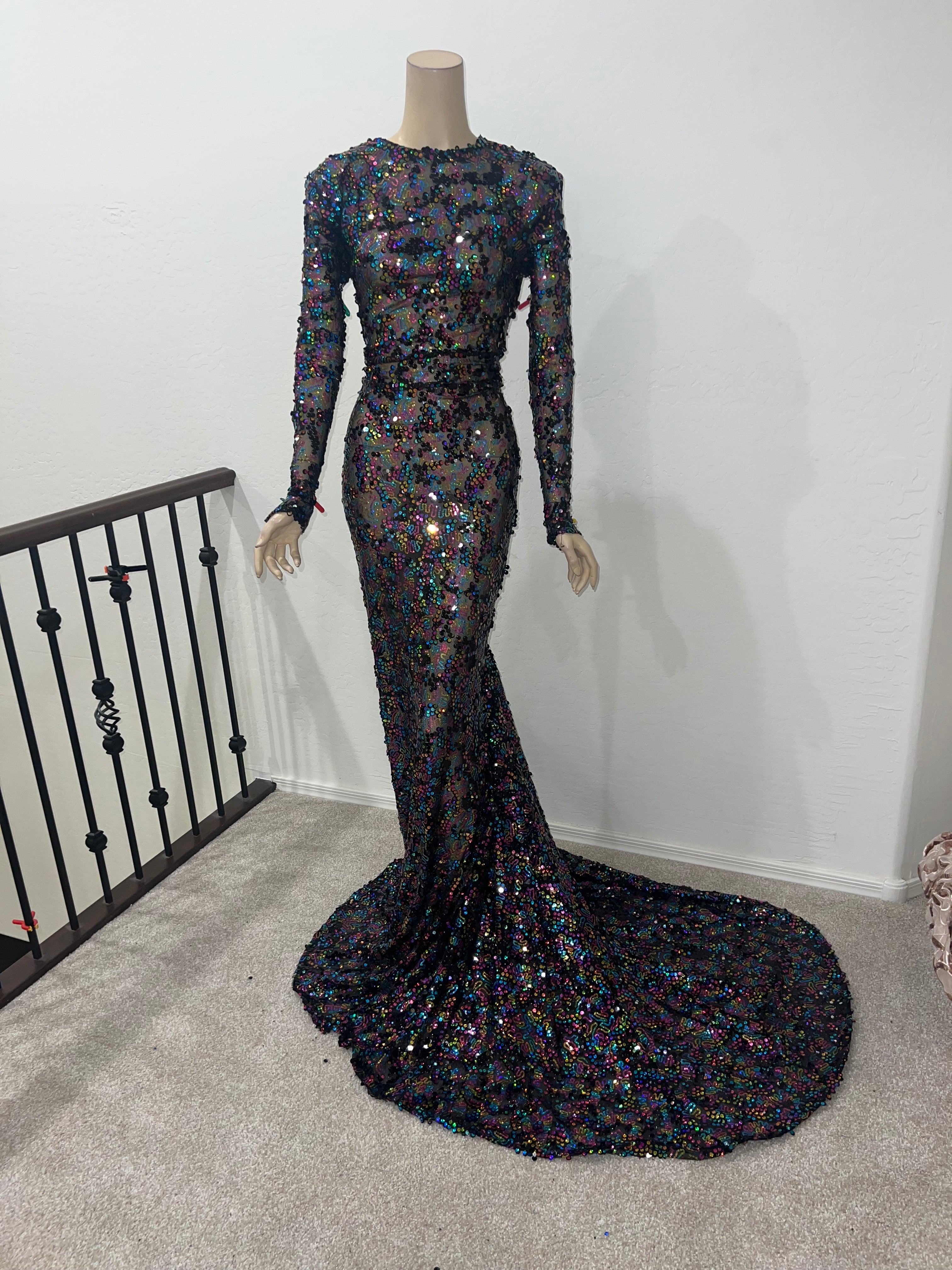 Full length gown with a high neckline, long fitted sleeves with a long train. Long zipper in back for easy changes. Made from a gorgeous stretch mesh fabric with sparkling black and rainbow sequin all throughout.