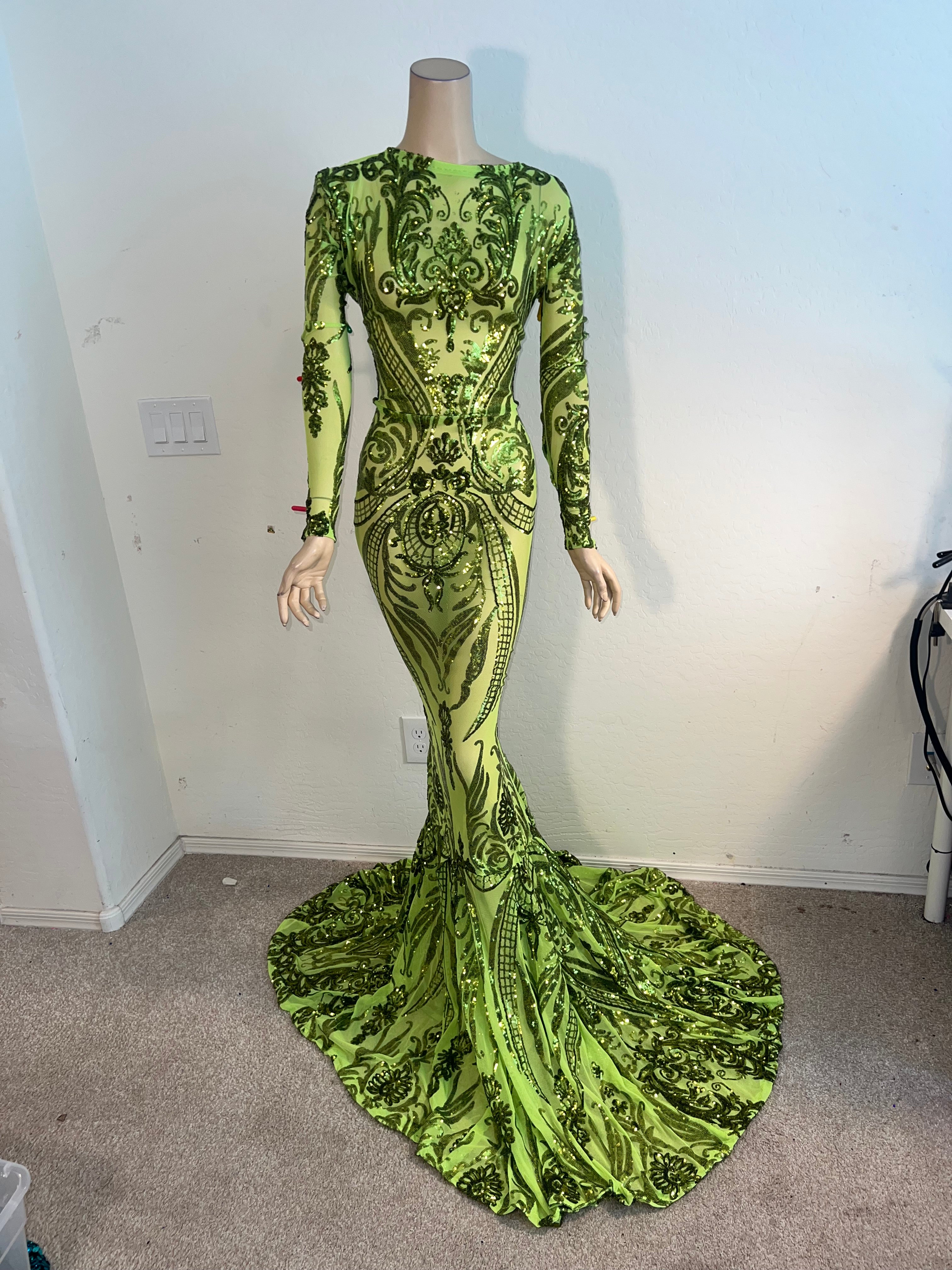 Full length gown with a high neckline with fitted sleeves, and trumpet bottom. Long zipper in back for easy changes. Made from a stunning and high quality stretch mesh with an intricate sequin design throughout in sequin ( this fabric is see through and the dress is unlined)